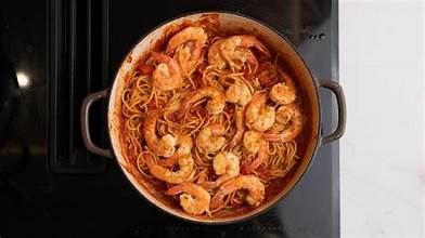 Pasta with shrimps — tomato & garlic sauce.