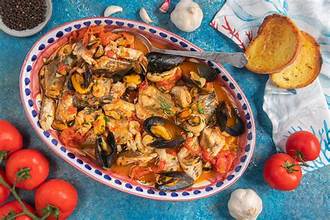 Hearty fish soup with mussels, clams & prawns.
